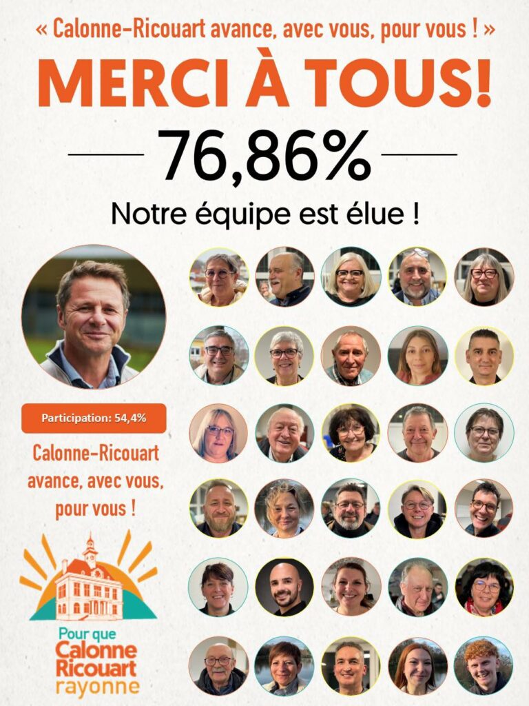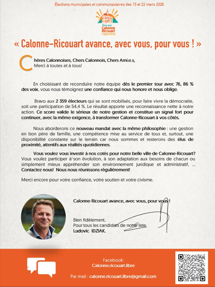 Bravo aux 2 359 électeurs qui se sont mobilisés, pour faire vivre la démocratie, soit une participation de 54,4%. Le résultat apporte une reconnaissance nette à notre action. Ce score valide le sérieux de notre gestion et constitue un signal fort pour continuer, avec la même exigence, à transformer Calonne-Ricouart à vos côtés.